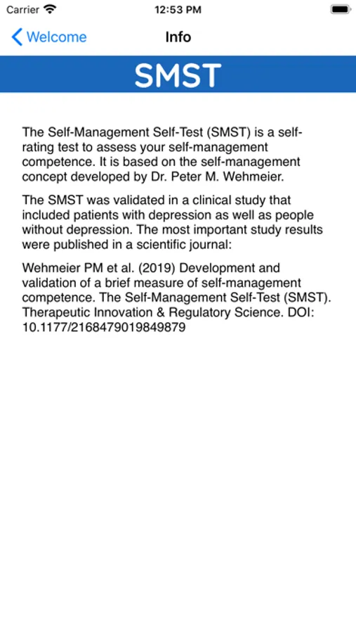 Wehmeier PM et al. (2019) Development and validation of a brief measure of self-management competence. The Self-Management Self-Test (SMST). Therapeutic Innovation & Regulatory Science. DOI: 10.1177/2168479019849879