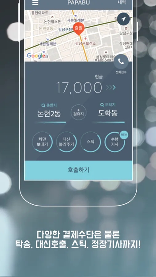 - '파파부'의 요금정산기술, 주소표시와 선택모듈, 원터치호출기능의 방식과 UI디자인은 특허권에 의해 보호받고 있습니다.
