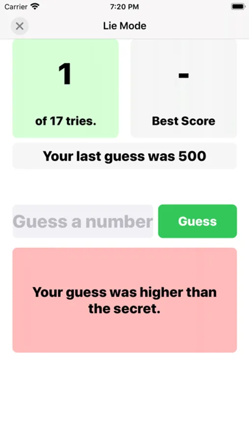 This is a number guessing game. The secret number is between 1 and 1000. For every guess you enter, the computer lets you know if your guess is lower or higher than the secret. This game has 4 modes: