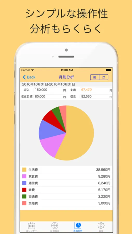 月別、年別、生涯の3パターンで、支出の分析が可能。円グラフ表示で見やすさにこだわりました。