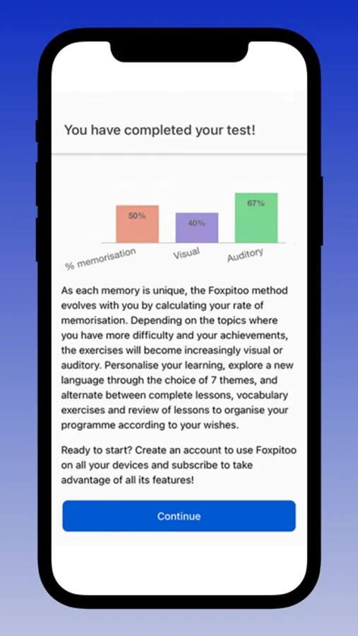 Customized lessons: Foxpitoo analyzes the results of your memory test to develop a personalized program, that will make learning a new language easy and fun.