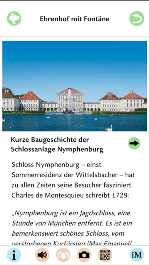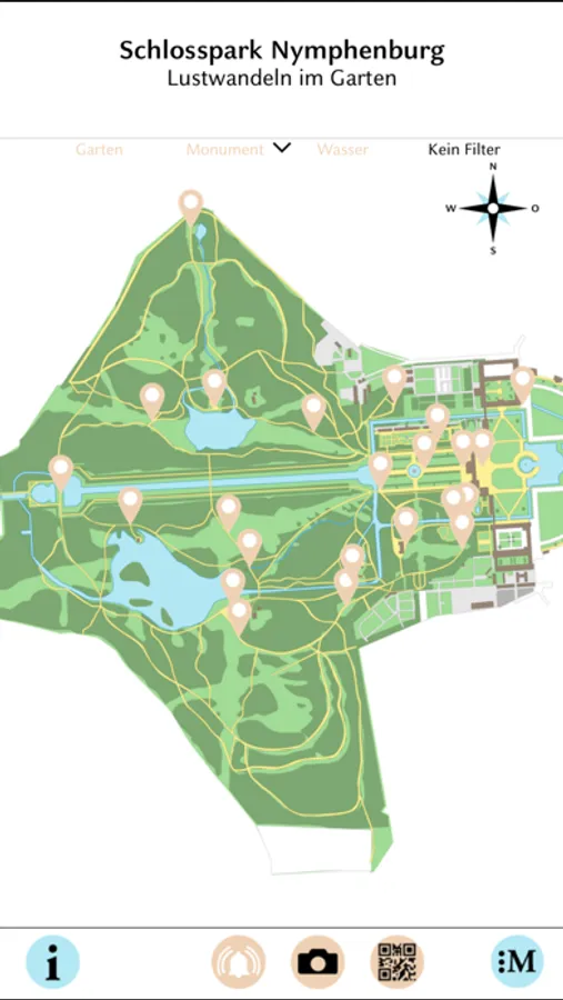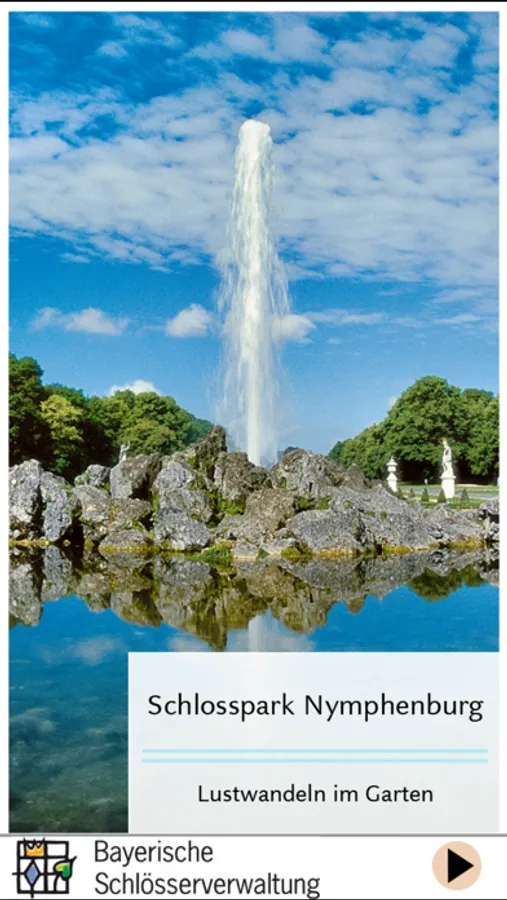 Die Applikation „Schlosspark Nymphenburg“ ist Ihr Begleiter zur Erkundung dieser historischen Parkanlage in München. An 23 ausgewählten Stationen erhalten Sie Informationen zur Geschichte sowie Hördokumente, Bilder und Filme zu Ihrem jeweiligen Standort. Alle Texte stehen Ihnen in der App auch als Audio-Dateien zur Verfügung.