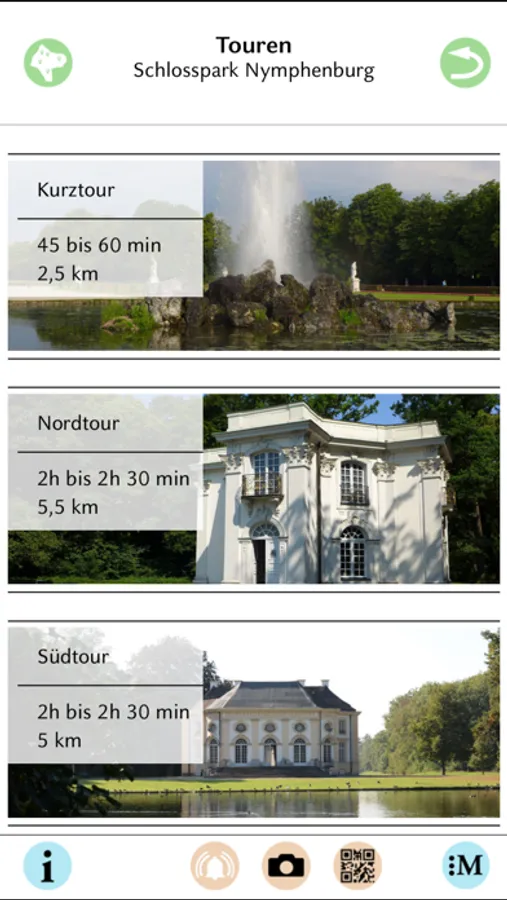 Es werden drei Tourenvorschläge angeboten. Die Touren sind GPS-basiert, d. h., bei aktiviertem GPS wird Ihr Standort in der Karte durch einen roten Punkt angezeigt. Wenn Sie sich einer der Stationen nähern, ertönt ein Signalton und Sie können Informationen zur Station abrufen. Natürlich können Sie den Schlosspark auch auf eigene Faust erkunden.