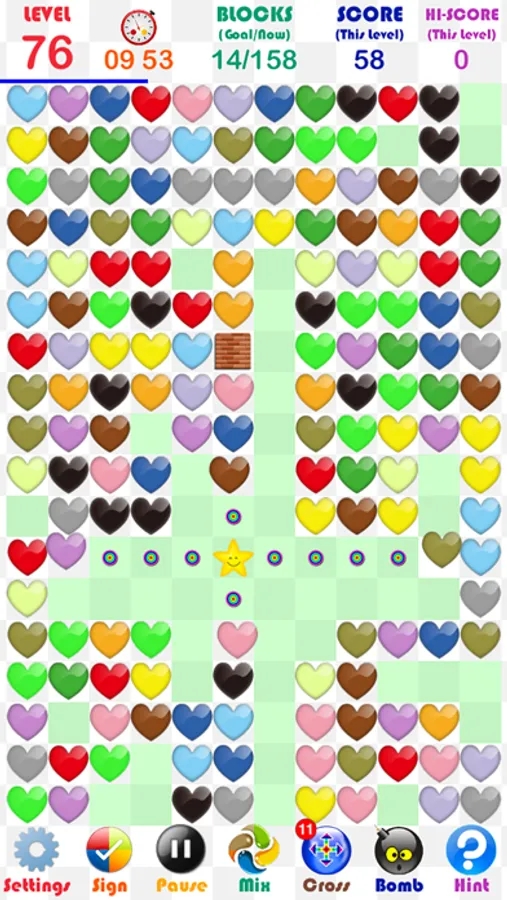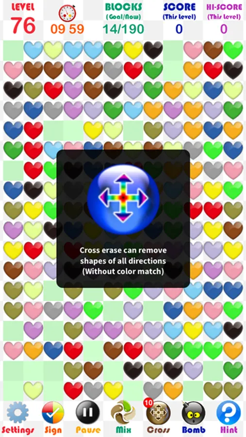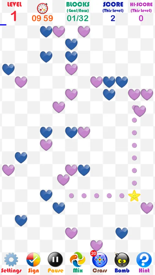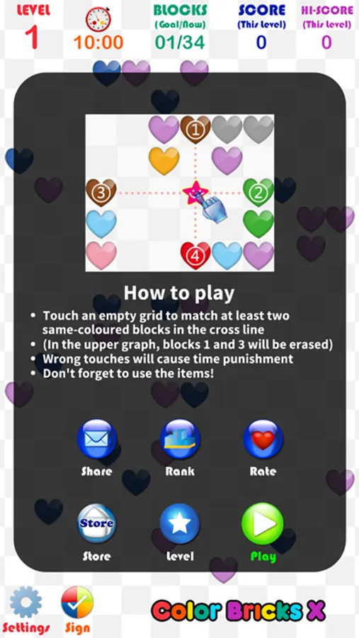 Touch an empty grid to match at least two same-coloured hearts in the cross line. Wrong touches will lead to timing deduction.Don't forget to use the items!