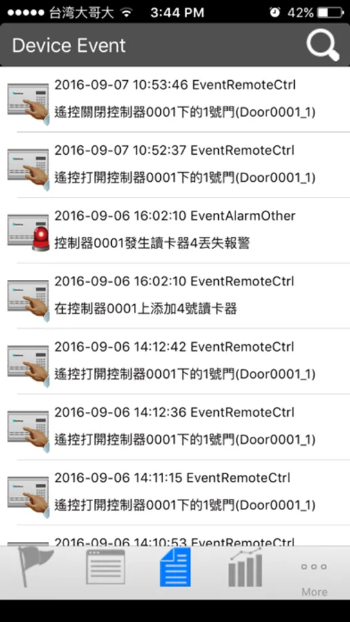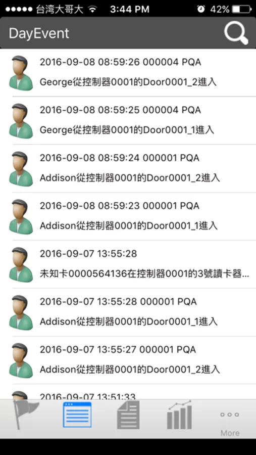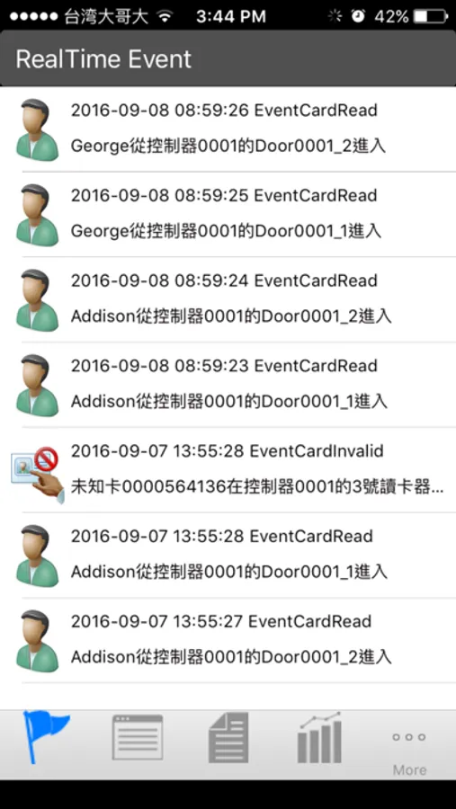 The “MobileAccess” application is integrated with EverFocus access control software, ENS2000, for users to manage the access control system on the iOS device. The app allows users to manage the system according to their user privilege levels. Users can check the realtime events, device events, history logs, attendance, detail information and the status of the devices. The app can trigger a sound or vibration when an event occurs. It supports the Wi-Fi or 3G networks for connecting to the server.