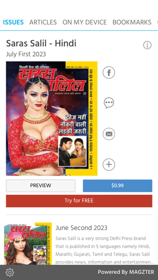 Saras Salil is a very strong Delhi Press brand that is published in 5 languages namely Hindi, Marathi, Gujarati, Tamil and Telegu, Saras Salil provides news, information and entertainment in a language that is simple to understand for the young educated masses. The magazine raises issues that are pertinent to the socio-cultural milieu of the urban and rural masses, including issues of class based discrimination, caste politics, identity, employment, economy, and societal framework from the perspective of working class households in urban and rural areas. Over the last 2 decades, the magazine has toed an extremely bold and progressive line in raising these issues with the aim of aiding the societal and economic upliftment of the masses. At the same time, the magazine has an entertaining side to it with a mix of racy imagery, satire, and buoyant stories. In the respect, Saras Salil is a complete read for the progressive working younger generation, with a strong emphasis on politics and social issues as matter to him, balanced with entertainment. Most importantly, the presentation of the magazine is such that the reader identifies himself with the context of the magazine, and which blends in with his socio-cultural environment.