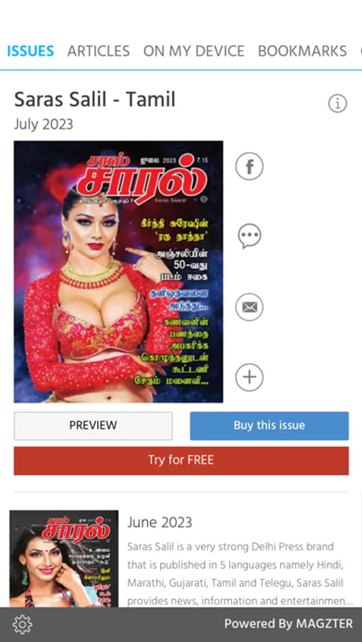 Saras Salil is a very strong Delhi Press brand that is published in 5 languages namely Hindi, Marathi, Gujarati, Tamil and Telegu, Saras Salil provides news, information and entertainment in a language that is simple to understand for the young educated masses. The magazine raises issues that are pertinent to the socio-cultural milieu of the urban and rural masses, including issues of class based discrimination, caste politics, identity, employment, economy, and societal framework from the perspective of working class households in urban and rural areas. Over the last 2 decades, the magazine has toed an extremely bold and progressive line in raising these issues with the aim of aiding the societal and economic upliftment of the masses. At the same time, the magazine has an entertaining side to it with a mix of racy imagery, satire, and buoyant stories. In the respect, Saras Salil is a complete read for the progressive working younger generation, with a strong emphasis on politics and social issues as matter to him, balanced with entertainment. Most importantly, the presentation of the magazine is such that the reader identifies himself with the context of the magazine, and which blends in with his socio-cultural environment.