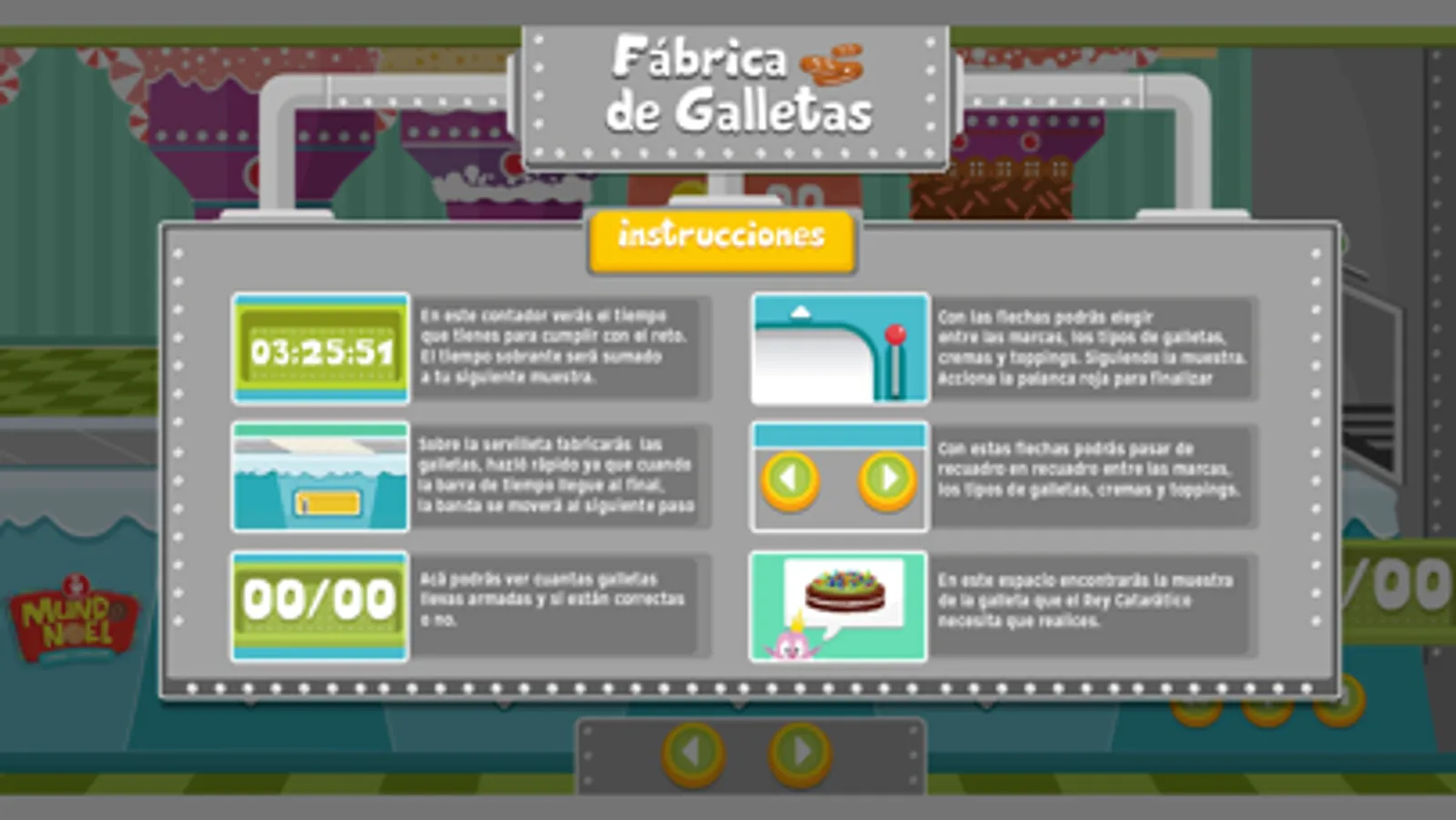 La Fábrica de Galletas Mundo Noel es un juego gratis donde en compañía de Papá Noel Galletero, aprenderás a combinar y crear las increíbles galletas Noel, mientras te diviertes mucho y ganas monedas para redimirlas por premios en el sitio web de Mundo Noel.