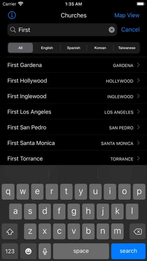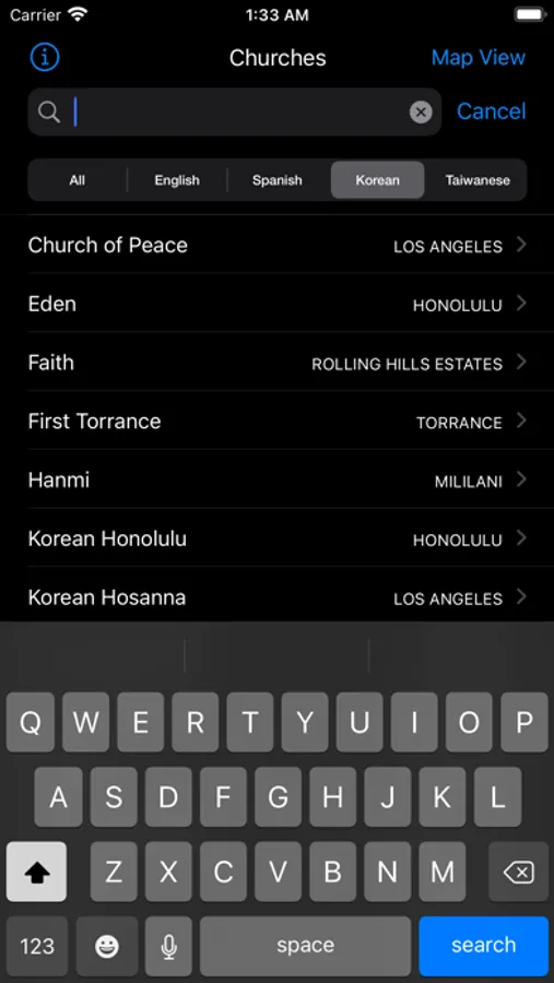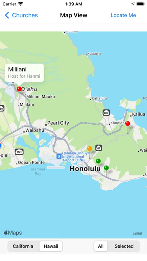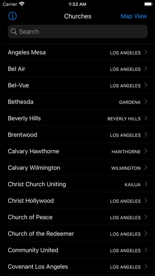 The PoP Churches App highlights all of the churches within the bounds of the Presbytery of the Pacific (PoP), a middle governing body of the Presbyterian Church (U.S.A.). The Presbytery of the Pacific includes churches within the greater Los Angeles area and the state of Hawaii. The PoP Churches App displays the location of all Presbytery Churches on a map view, allowing the user to quickly locate nearby churches, or any selected church within the Presbytery. The user can also search for churches by name, city, state, and language spoken. Church pins on map views are color coded to indicate the primary language spoken in worship services.