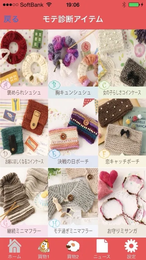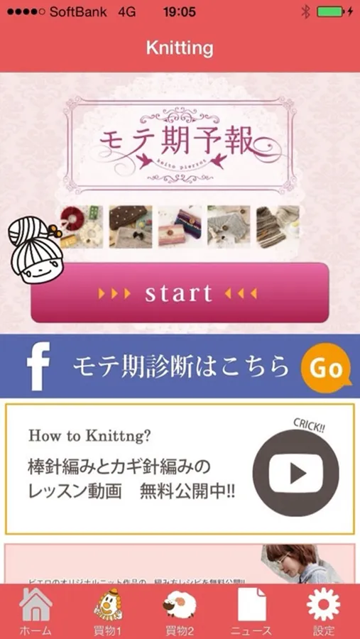 編み物デビューにぴったり! Face bookの《モテ診断アプリ》で出たあなたの「モテアイテム」を専用ムービー を見ながら楽しく作れちゃいます 「編み物に挑戦したいけど、よくわからなく て…」という完全初心者さんにもおすすめ!!世界にたったひとつのオリジナル 手作りアイテム。分かりやすいムービーで完成までを完全サポートいたします。 出来上がった作品はツイッターやface bookにUPしてみんなに自慢モテ女子に必 須の家庭的な魅力を身につけてあなたのモテ度をどんどんアゲちゃいましょう。 モテ診断の診断結果に表示される「モテアイテム」は、楽天市場内【毛糸ピエロ 】でご購入いただけます。※診断をされた方限定の特別商品となります。 《Knitting》は毛糸業界で日本最大級の品揃えを誇る「ごしょう産業」のオリ ジナルアプリです。