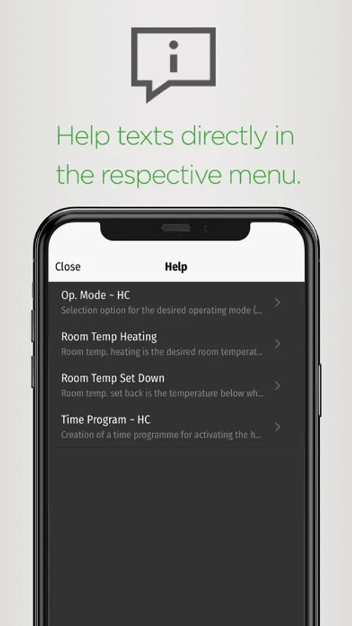• Help texts directly in the app matching the displayed screen