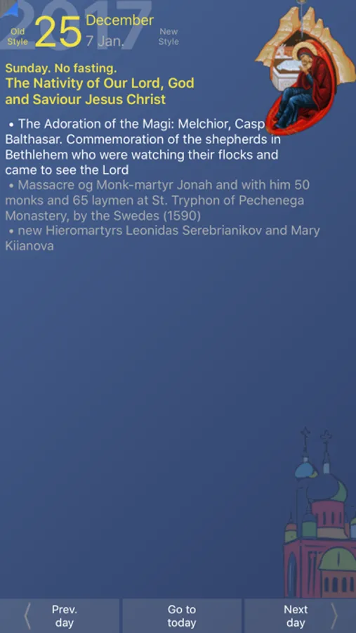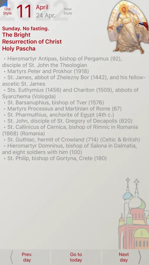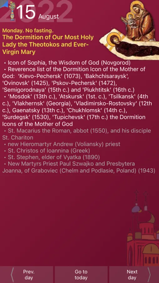 The calendar includes the full calendar of feast and saints. It does not require internet connection, so it will display the feast, or the saint of the day, even if you are on Sinai or Mount Athos :-)