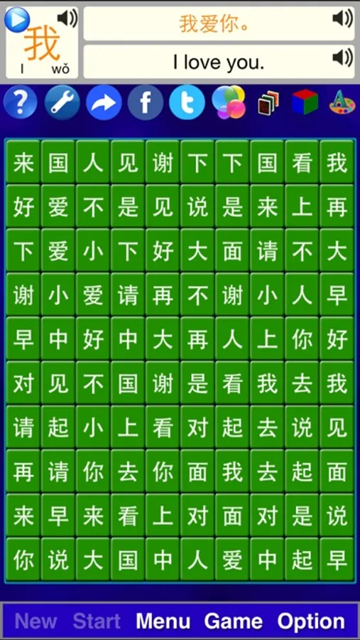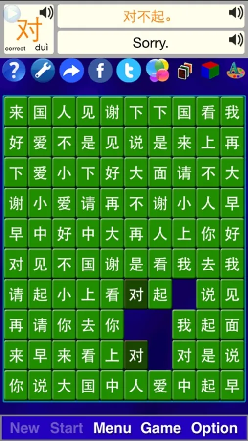 Learn 25 most frequently used Chinese characters during playing the game. Turn on sound option to listen to pronunciation of 25 characters and 25 basic greeting sentences. It's full of fun and education.