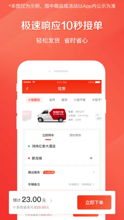 快狗打车APP致力于为用户提供拉货、搬家、运东西等短途货品运送及交易服务。高效满足各类用户的不同类型短途货物运输及物品运送需求。