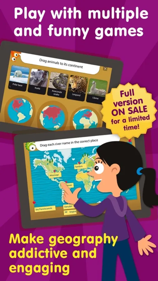 Kids World Atlas is a game that gives kids a chance to explore our planet through exciting activities and games. It features engaging lessons that teach about rivers, animals, mountains, volcanoes, geography, and much more.
