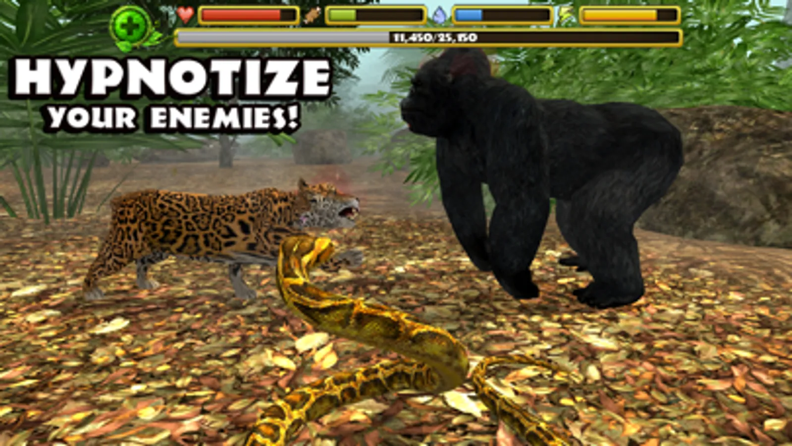 + EPIC BATTLES - Use your razor sharp fangs, swift speed, and hypnotic stare to hunt down tasty critters and fight dangerous rainforest animals like the silverback gorilla!