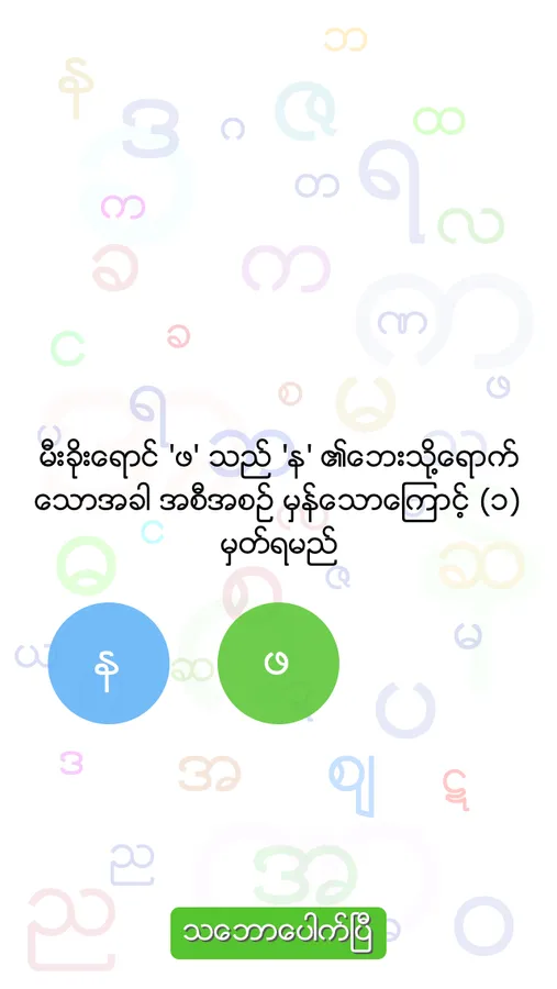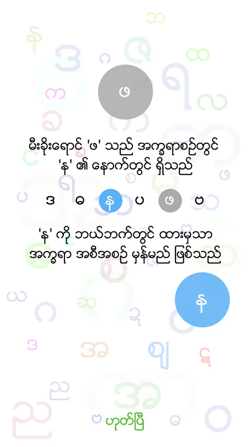 Byee is an easy yet challenging game that everyone who knows Myanmar Alphabets can play. Byee tests how fast you remember the ordering sequence of Myanmar Alphabets.