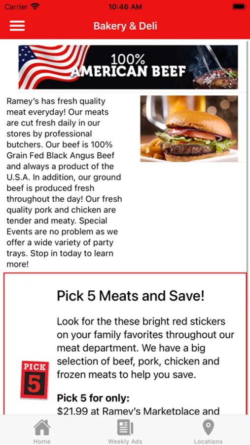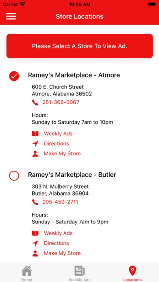 Ramey's Marketplace has over 24 locations in Alabama, Louisiana and Mississippi. Our app streamlines grocery shopping, store location, hours of business, weekly specials, recipes for meals, and a customizable grocery list all available at your finger-tips!