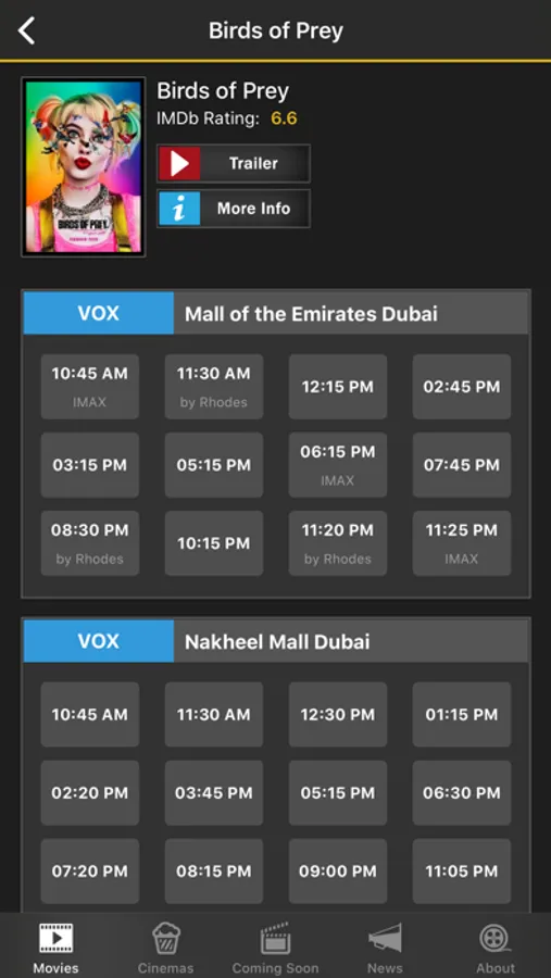 No need to download dozens of apps for each cinema or browse through different website to check showtimes and book movie tickets. This single app covers over 50 cinemas in United Arab Emirates across Dubai, Abu Dhabi, Sharjah, Al Ain, Ajman, Ras Al Khaima, Fujairah.