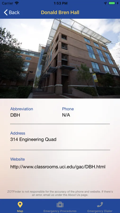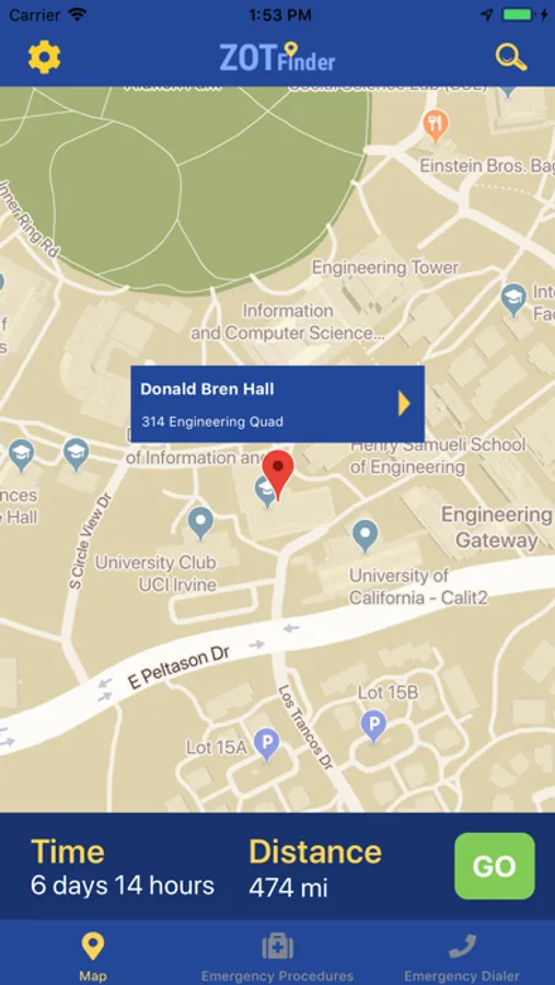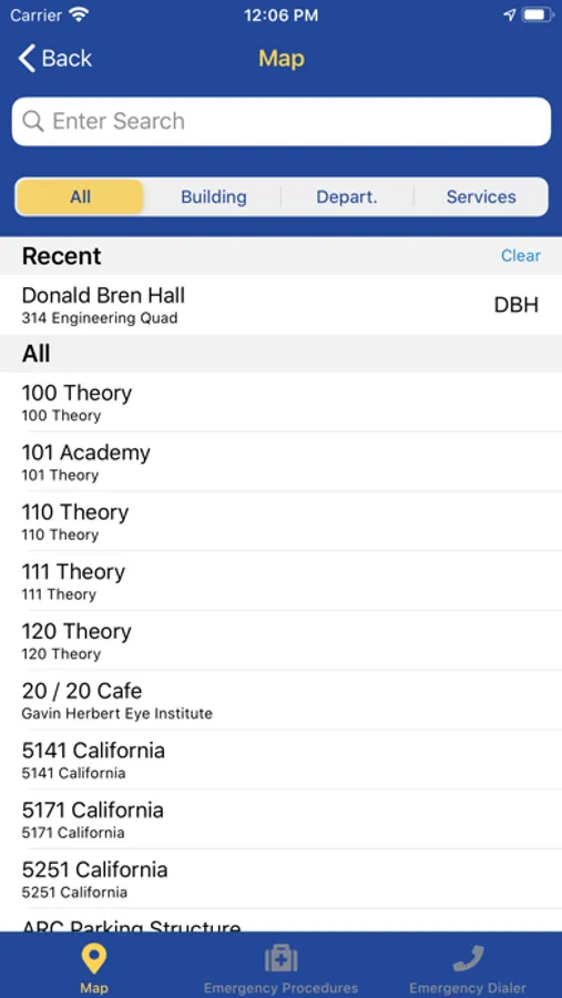 Search for buildings, Departments or services on the UCI campus as well as the location of professors' offices.