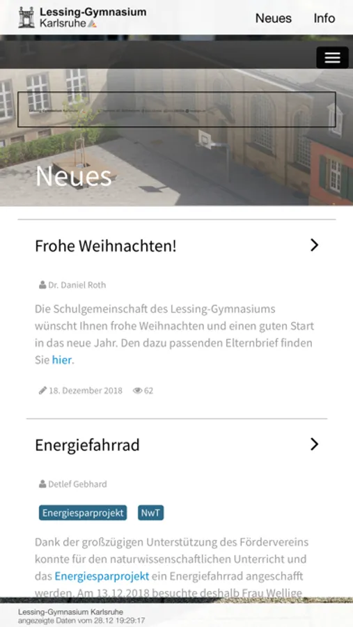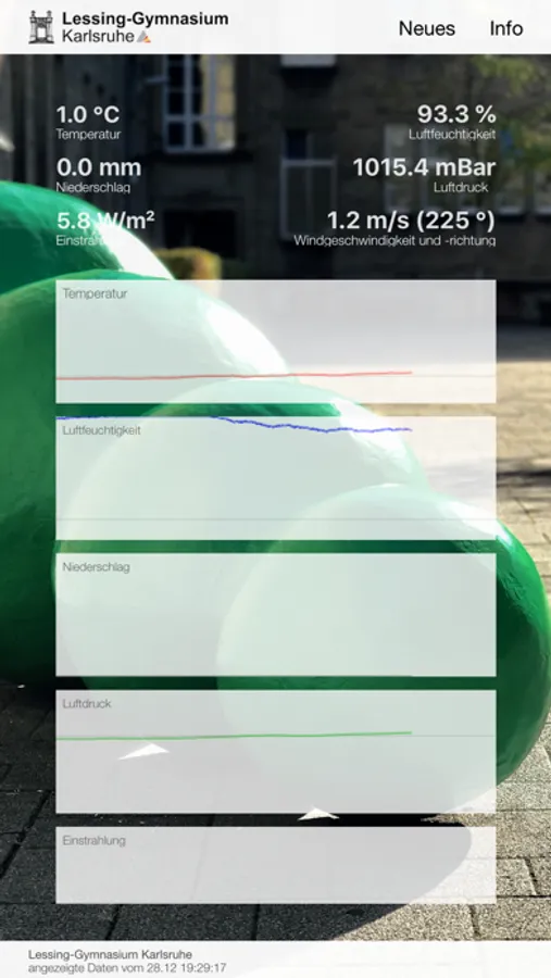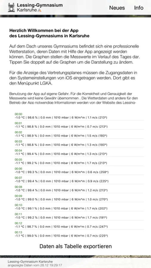 App zur Anzeige der Werte der Wetterstation auf dem Dach des Lessing-Gymnasiums in der Weststadt von Karlsruhe. Nach Angabe von Nutzername und Passwort in den Systemeinstellungen von iOS (Menü "Zahnrad" und dann nach unten zu LGKA wischen) zeigt die App auch den aktuellen Vertretungsplan des heutigen und des morgigen Tages an. Dazu das Gerät einfach nach links bzw. nach rechts drehen.