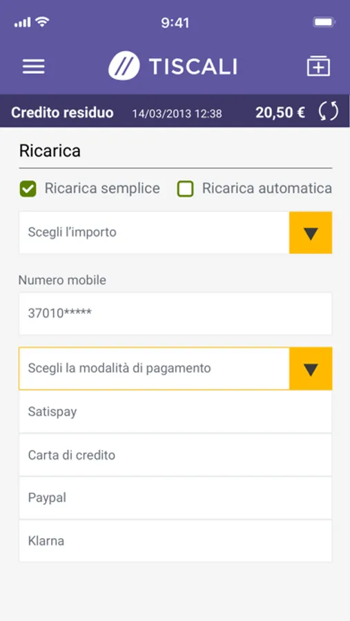 - possibilità di ricaricare e storico ricariche;