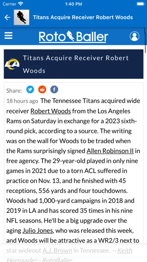 RotoBaller.com’s fantasy sports player news updates for NFL, MLB, NBA, NHL, PGA and NASCAR, all combined into one app. Turn on push notifications to receive our breaking news alerts, timely injury updates, the latest player news updates, and in-depth fantasy analysis articles for six sports - Fantasy Football, Fantasy Baseball, Fantasy Basketball, Fantasy Golf, Fantasy NASCAR, and Fantasy Hockey.