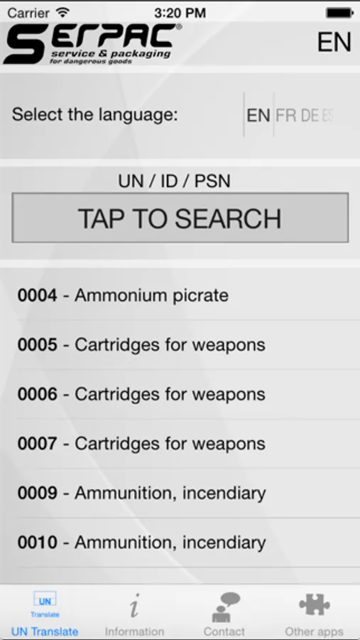 UN translate è un’applicazione che vi permetterà di visualizzare in 4 diverse lingue tutti i numeri ONU e relative designazioni ufficiali di trasporto (Proper Shipping Name – PSN) come riportati sui Regolamenti ICAO/IATA (per trasporto di merce pericolosa via aerea). Se conosci il numero ONU della tua merce ma non sai il PSN digitando il numero ONU visualizzerai il PSN corrispondente. Viceversa se non conosci il numero ONU ma hai solo il PSN digitandolo ti apparirà il numero ONU corrispondente.