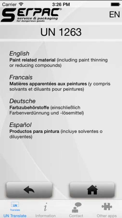 UN translate is an application that will allow you to display in 4 different languages all UN Number and the corresponding Proper Shipping Names (PSN) as show in ICAO/IATA Regulations (for transport of dangerous goods by air). If you know the UN Number of your goods but you don’t know the PSN you can write the UN Number and the app will display the corresponding PSN. At the same time, if you know the PSN of your goods but you don’t know the UN Number you can write the PSN and the app will display the corresponding UN Number.