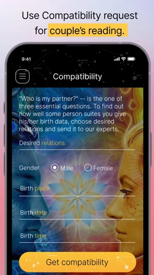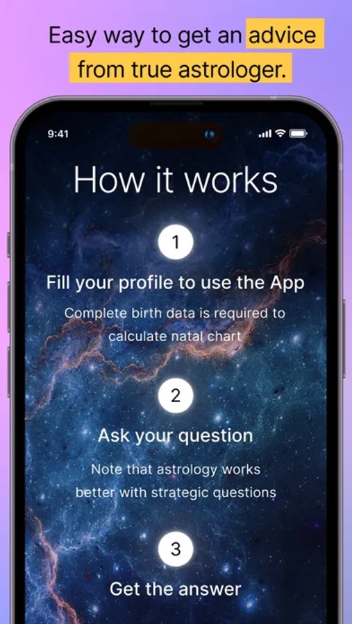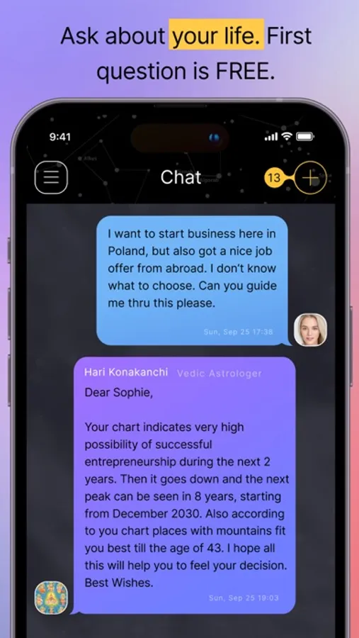 Share your birth data and question. Our team of astrological consultants will calculate your natal chart using your provided birth data and respond based on its insights. The first consultation is free. For more questions, choose between individual purchases or discounted packs.