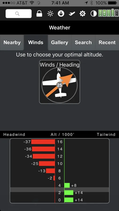 Amazing "4D Predictive Weather" uses a Timeline and Altitude slider to make detailed pre-flight and in-flight analysis easy. The Graphical Wind Optimizer uses red and green bars to show the headwind or tailwind at different altitudes. Also includes an extensive gallery of weather images.