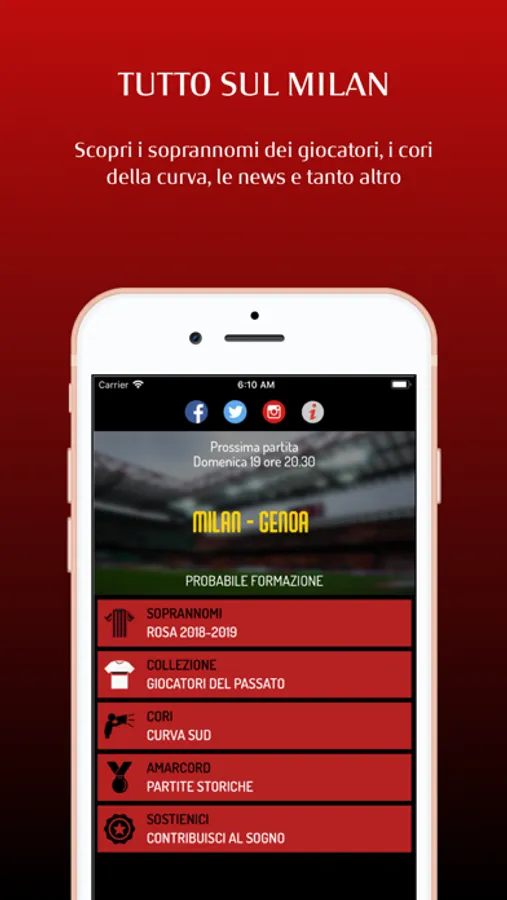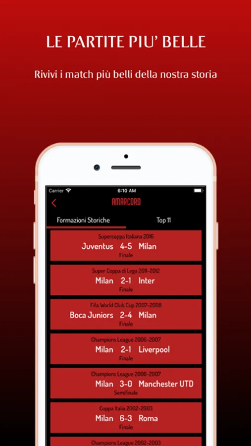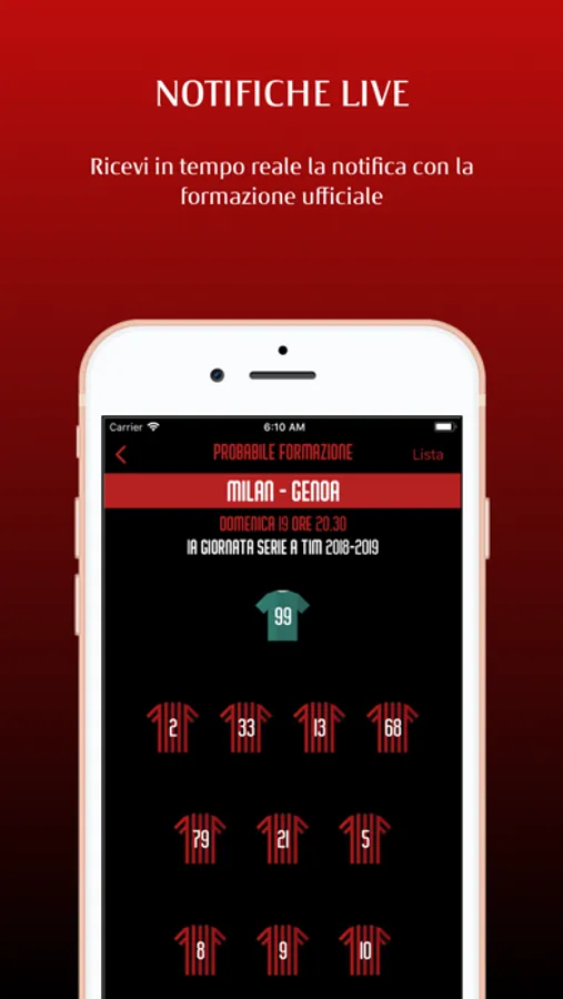 L'app suggerisce la probabile formazione che viene ufficializzata, tramite una notifica push, poco prima del calcio d'inizio. Le formazioni storiche permettono di rivivere le emozioni delle partite che hanno reso il Milan la squadra più titolata al Mondo!