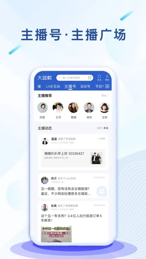 ●是江苏广播所有主持人官方宣传门户,江苏广播每位主播均拥有专属主播号,主播号展示主播的实时动态、个人风采、音视频节目、live互动、活动等内容,是主持人和听众密切联系的用户社区。