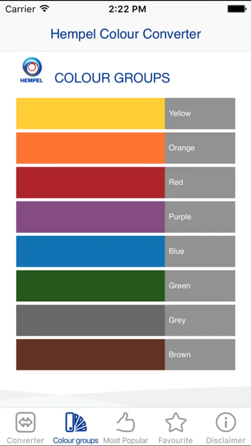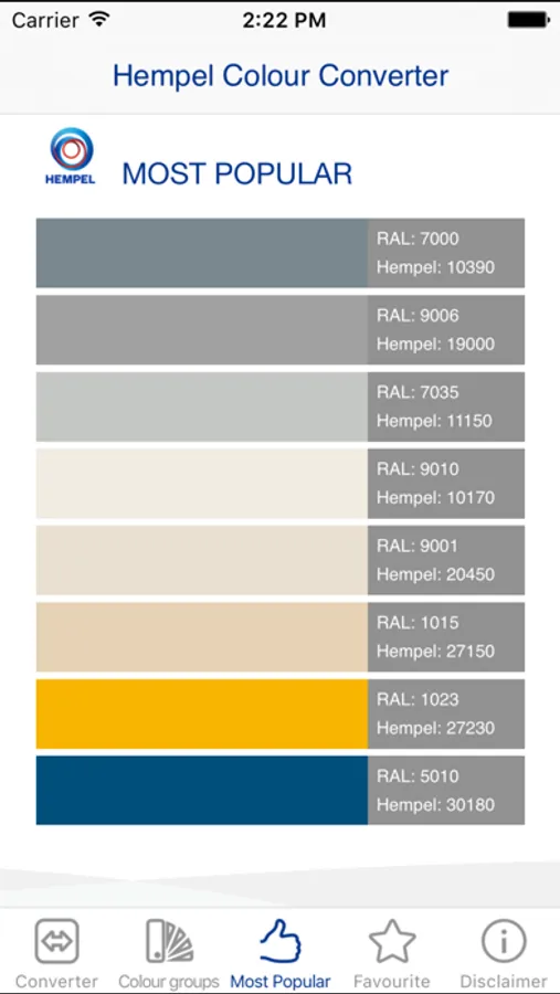This application enables you to find equivalent Hempel and RAL Classic colour shades, and also similar colours and colour groups. It also shows you the ‘Most Popular’ shades in Hempel.