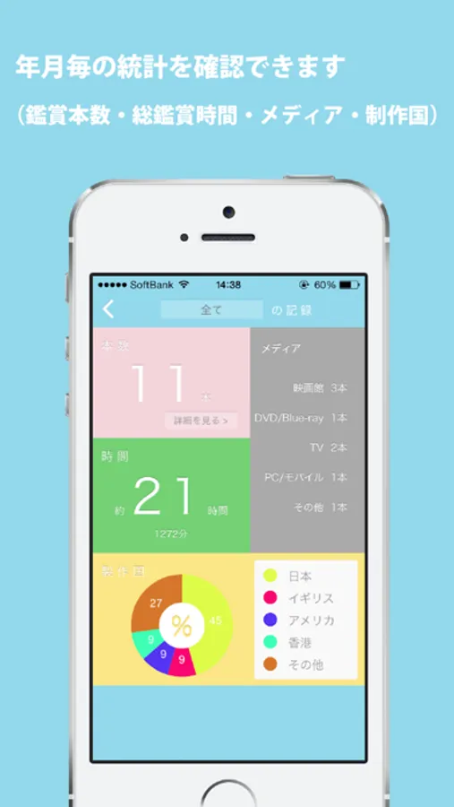 ー過去の記録の全て、または年月毎の統計(鑑賞本数・総鑑賞時間・メディア・制作国)を確認可能です。