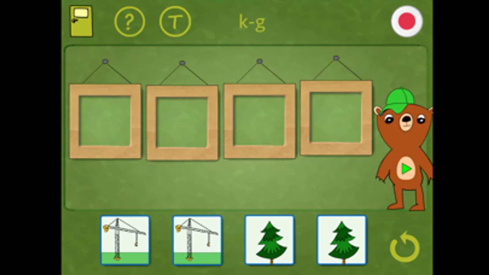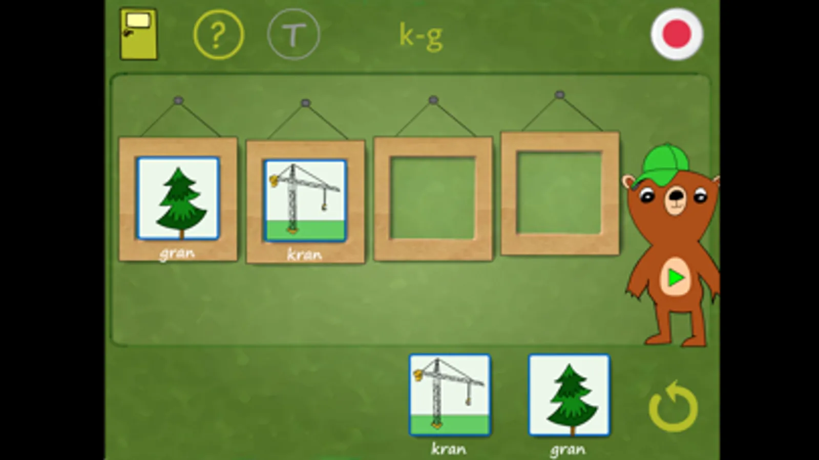 Lyssna på nallen som vill ha en viss ordning i sitt galleri. Ni får fyra bilder per övning att dra och släppa på tavelramarna. Nallen säger till exempel: klass, glass, glass, klass eller kran, gran, kran, gran. Blev det rätt ordning? Nallen ger feedback som ”försök igen” eller ”bra!”. Tryck på “startaom-pilen” så får du en ny övning.