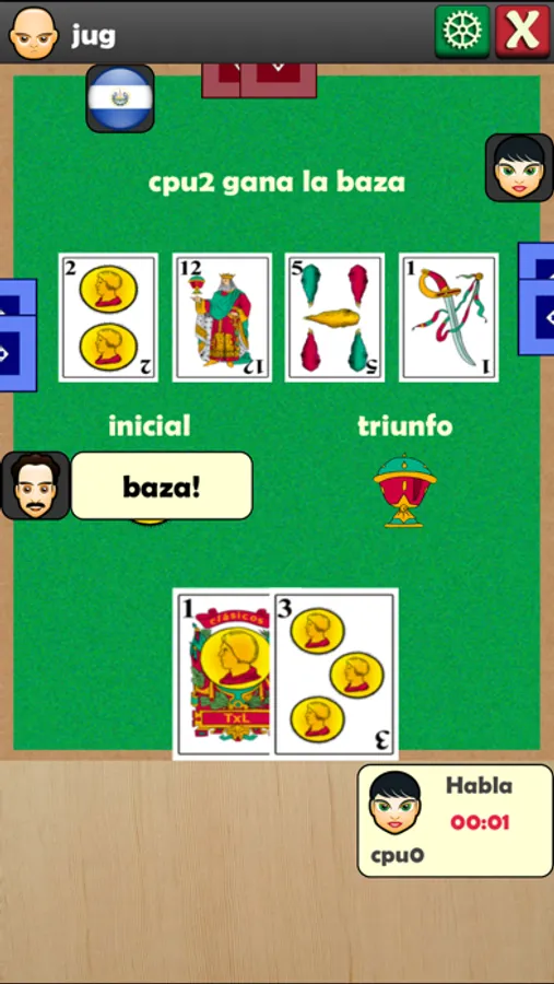 Gana la baza el jugador que haya colocado el triunfo de valor más alto o si no hay triunfos la carta del palo de inicio (la primera que se ha tirado) de valor más alto.