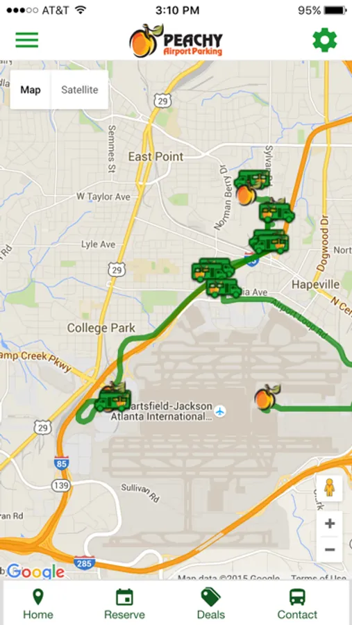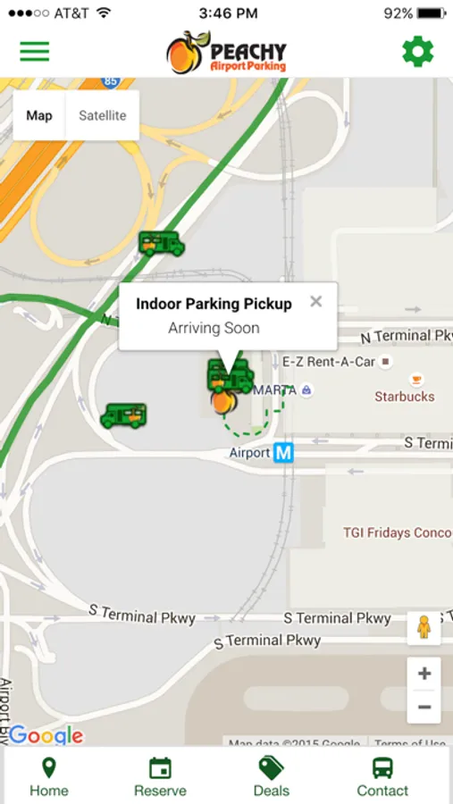 Peachy Airport Parking proudly offers Atlanta’s first and only GPS-enabled shuttle tracking app. The Peachy App lets patrons of Peachy Airport Parking view and connect with our shuttle bus system in real time. Save your space number, find your pickup station at the Atlanta ATL Airport, determine the next shuttle arrival and send the dispatcher a pickup request in just a few taps.
