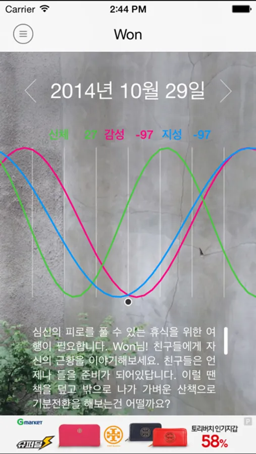바이오리듬(Biorhythm)에서는 각각의 상태를 종합하여 오늘의 코멘트를 제공합니다.