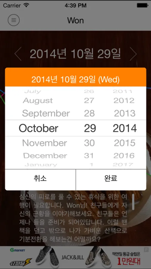 날짜텍스트를 탭하면 팝업창을 통해 특정날짜의 바이오리듬을 조회하실 수 있습니다.