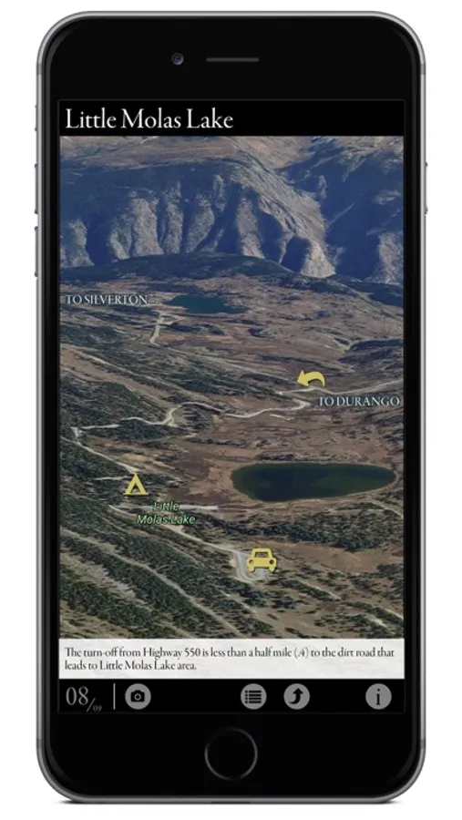 This app will guide you along your journey through the towns of Silverton, Ouray, Ridgway, Telluride, Dolores, Cortez, Mancos, and Durango. Each segment highlights stops along the way that shouldn't be missed. Beautiful photographs (many of which have direct links for purchase), insightful descriptions & information, and maps & directions are displayed for all 31 highlights.