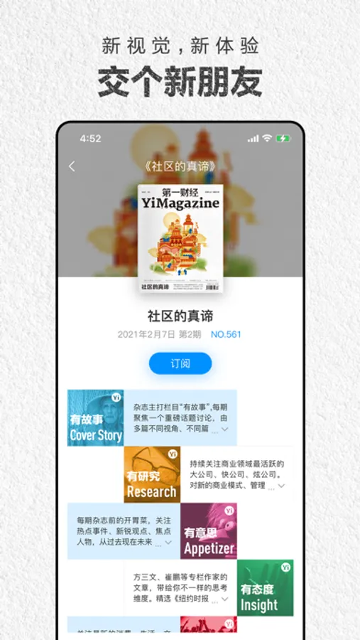 2019年,《第一财经周刊》转型升级为月刊 ——《第一财经》杂志YiMagazine,更侧重于大型的、多元维度的重磅报道策划,以及数据的可视化呈现。这本杂志比书籍更丰富,比杂志更深度——可以说原创了一种新型的阅读产品,解决因为互联网资讯繁荣给出版物带来的时效性桎梏,沉淀下那些真正需要探讨的问题。变化的,是更深度的内容和更丰富的阅读体验;坚持不变的,是“探索明亮的商业世界”的价值观,和对新的、有趣的传播形式的探索。