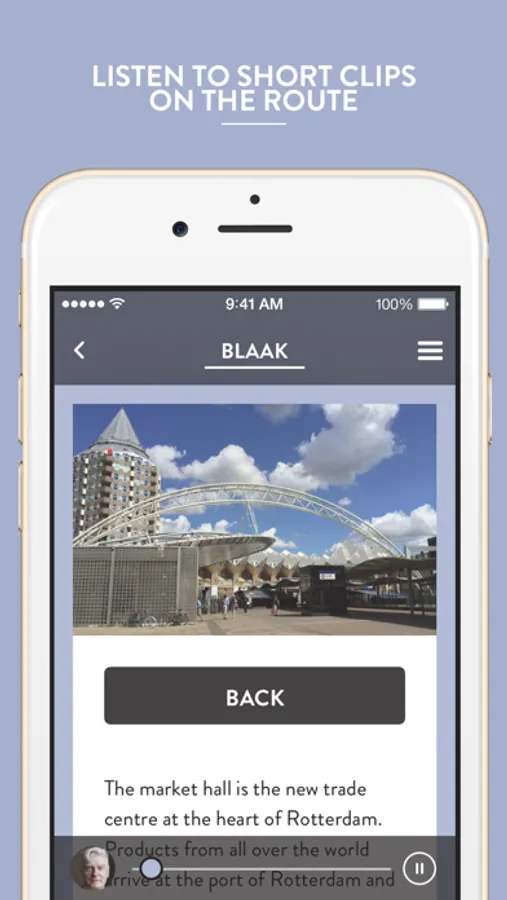 Start the route when you're in Rotterdam, walk to the starting point, put your headphones on or your earplugs in and start your discovery!