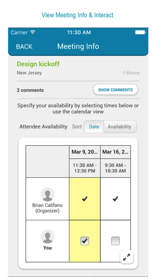 Find a time that works for everyone. Getting people together for meetings, parties, or other events with email chains and phone tag is challenging. NeedToMeet makes it easy to work around conflicts, time zones, and anything else that can get in the way. Our calendar is simple—select dates and times around your schedule and find out which ones will work for your attendees. You can access all your meetings from the App or from our site.