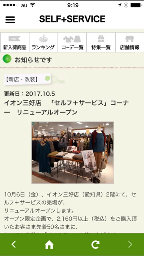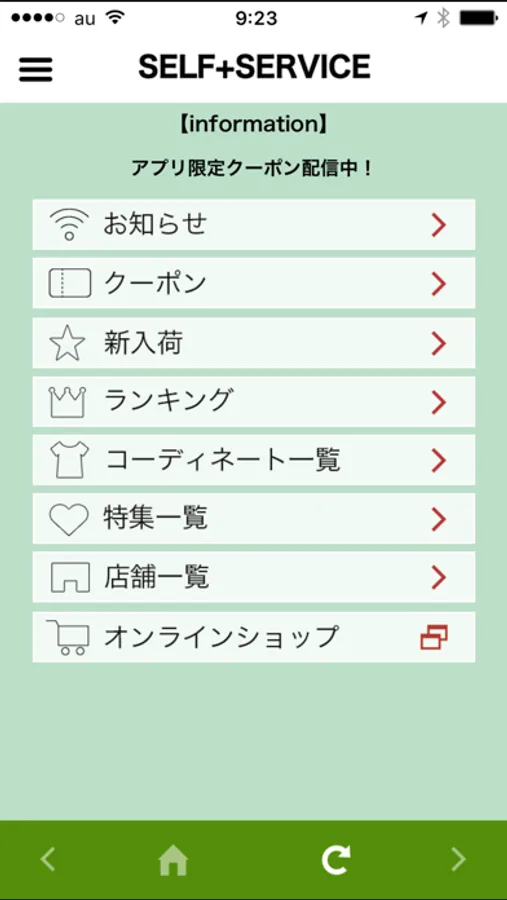 SELF+SERVICE公式アプリ。アプリ限定のクーポンやおすすめコーディネート等を見ることが出来ます!