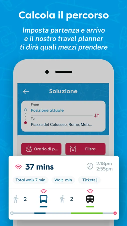 - Calcola il percorso: dicci dove vuoi arrivare e il nostro travel planner ti dirà esattamente quali mezzi prendere, inclusi i Atac e Trenitalia.
