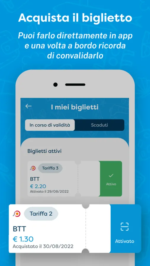 - Acquista il biglietto direttamente in app e quando sali a bordo del bus, ricordati di validarlo inquadrando il QR-Code.
