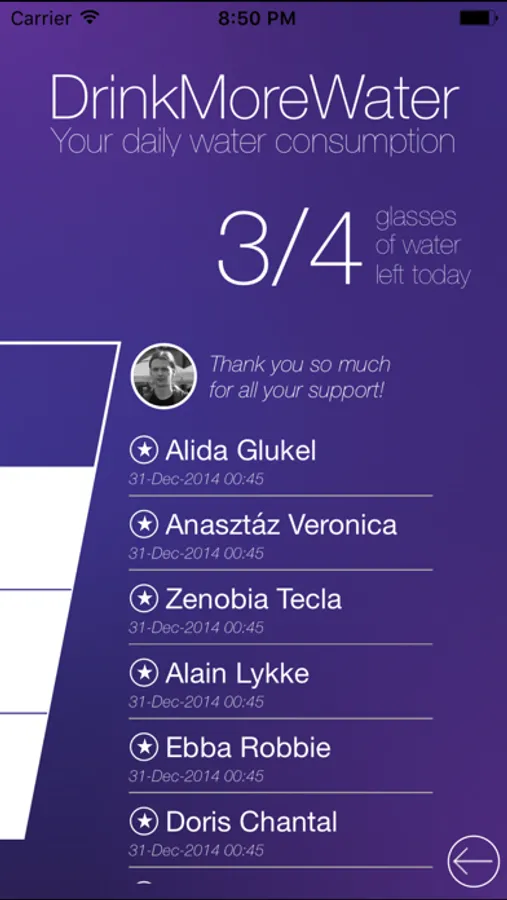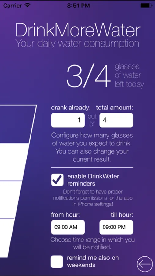 With reminders and app icon badge mechanism, you will be able to see how many glasses of water are left for today. And all that without even opening the app!