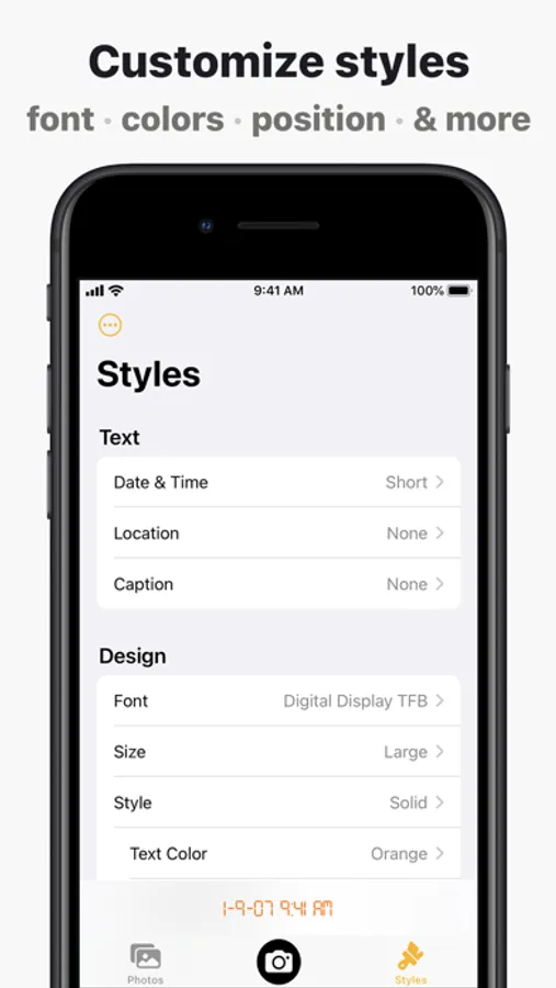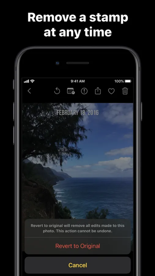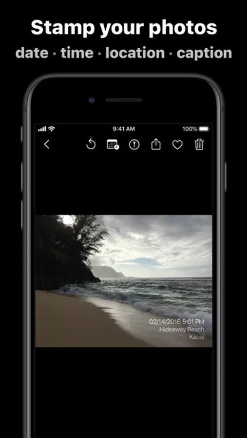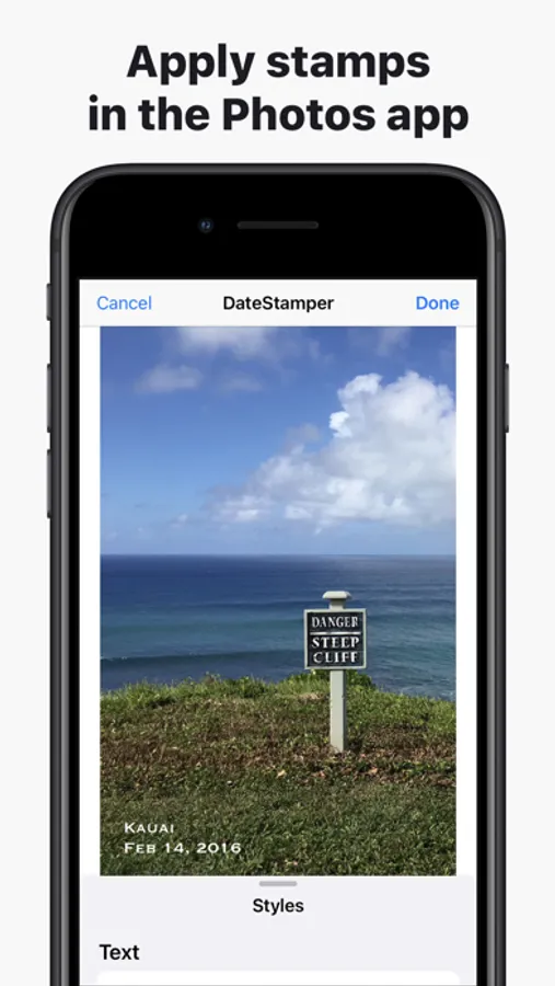 The modern photo date stamp is here! Easily add a stamp to your photos so you can remember when or where they were taken. This is especially useful when printing pictures to display in albums and scrapbooks, preserving your memories. The best feature of point and shoot cameras is now available on your iPhone, iPad, and Mac (and better than ever).