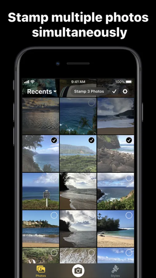 ◦ Easily select photos from your library to stamp — select each individually, swipe to select, select a range, or select all photos in an album